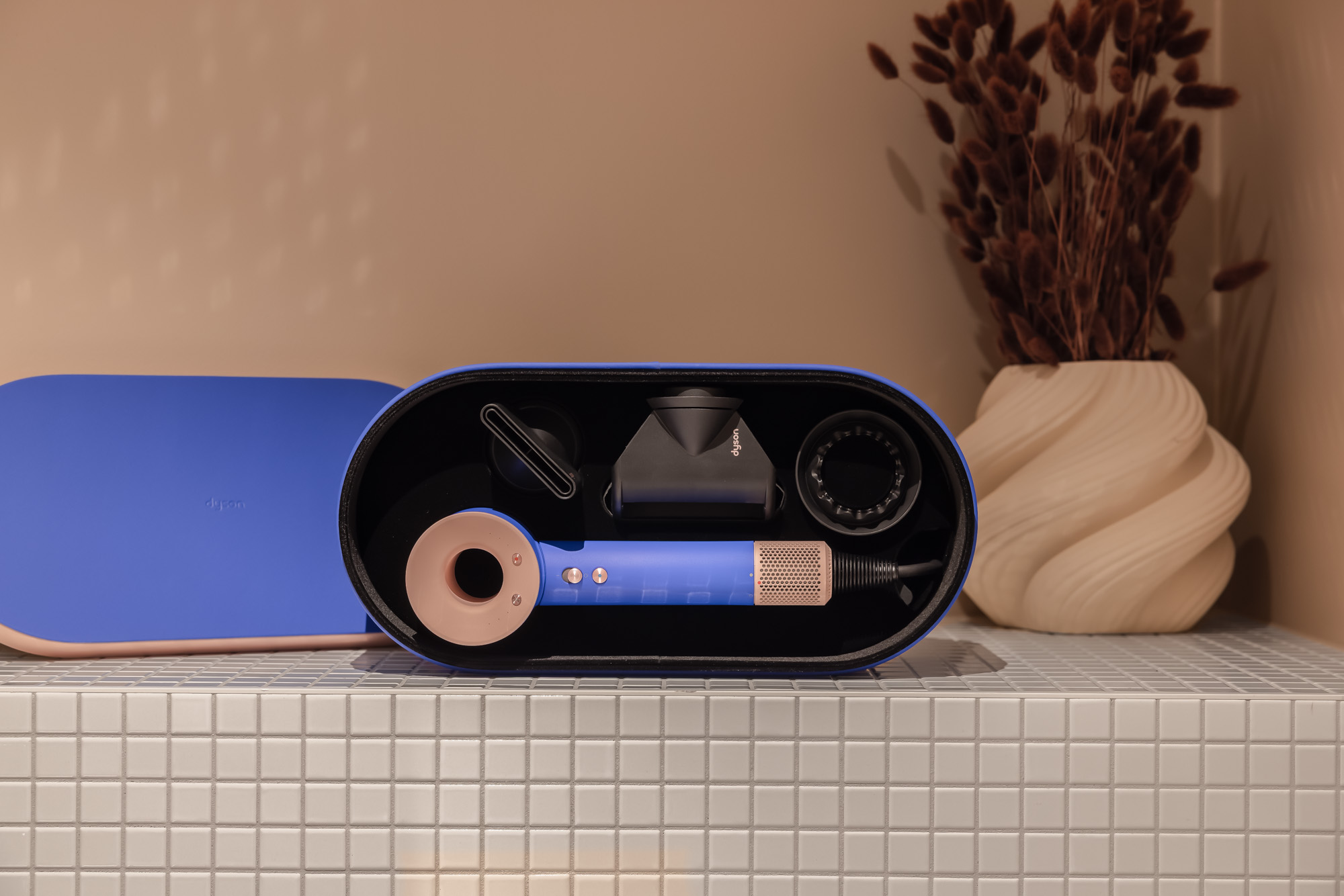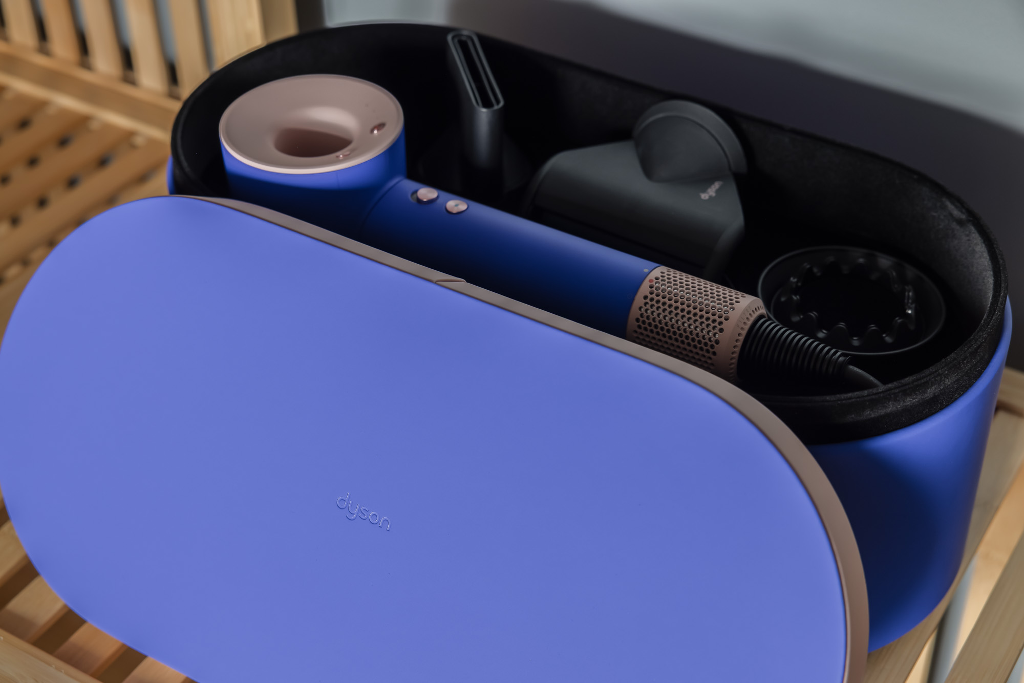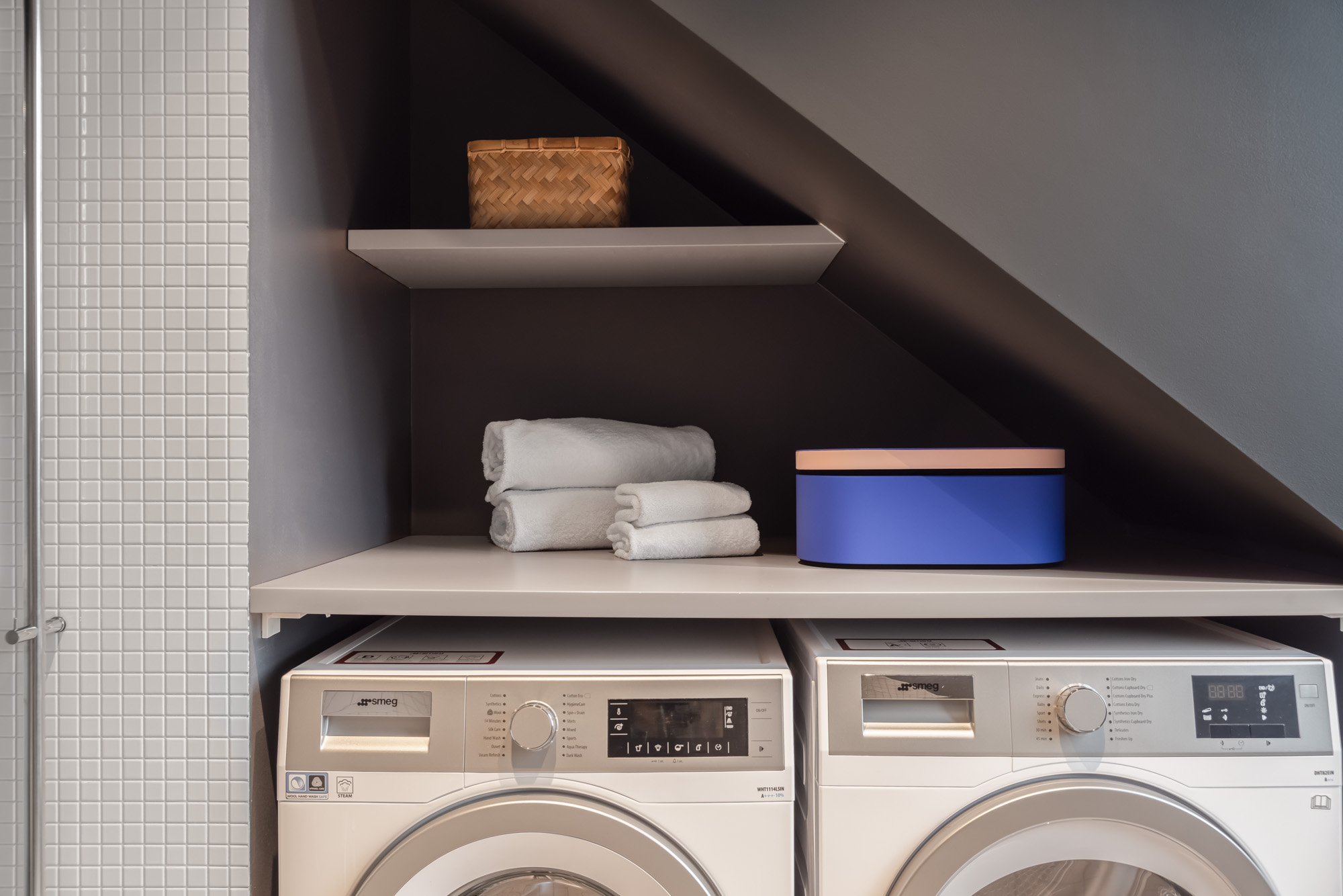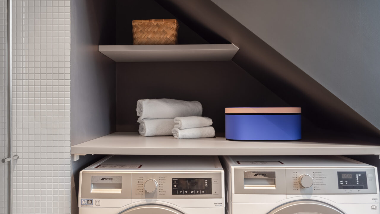 • The primary bathroom includes a shower, WC, washer, dryer, iron and ironing board, and a Dyson hairdryer.