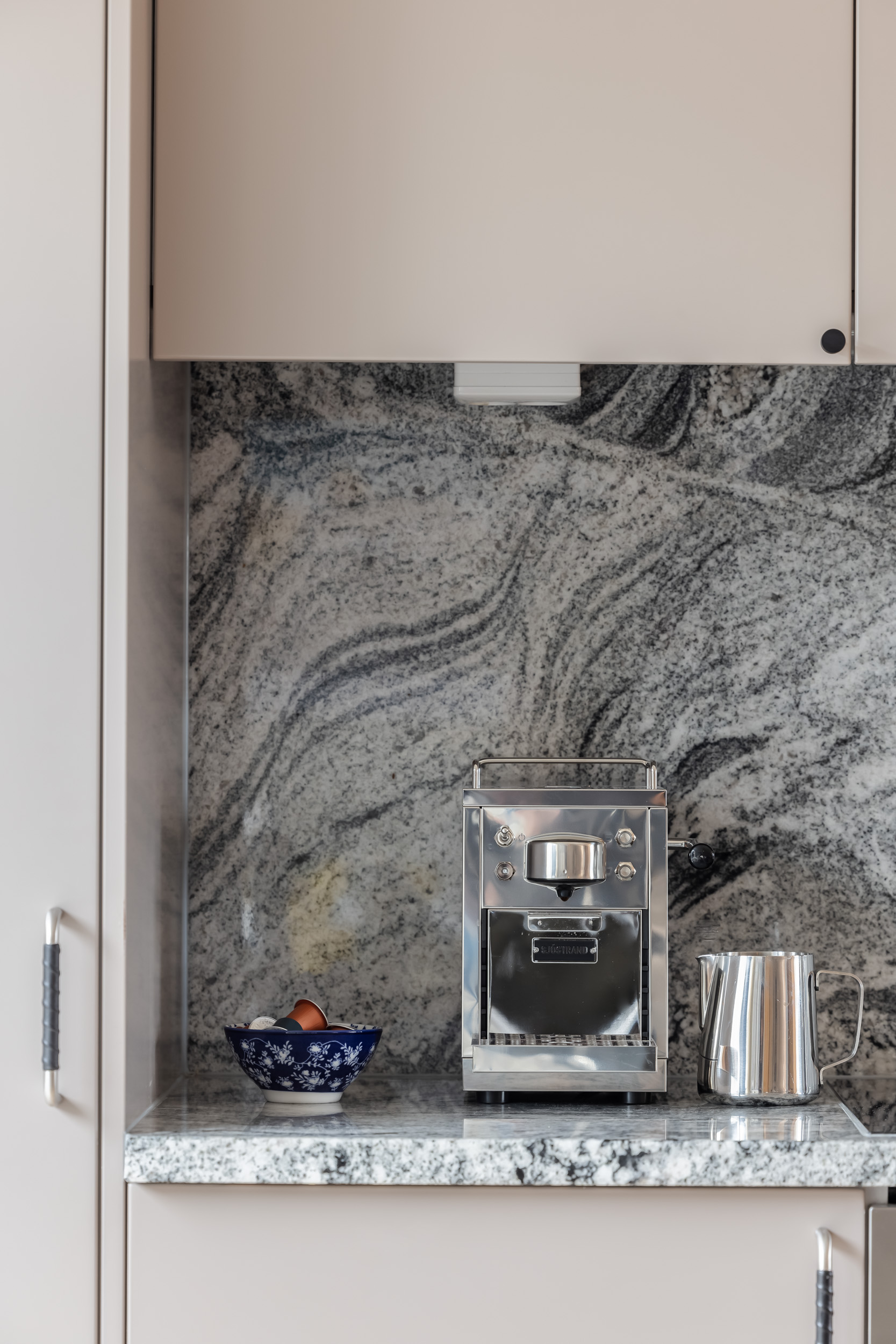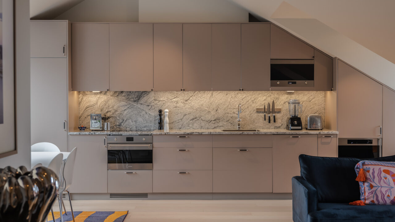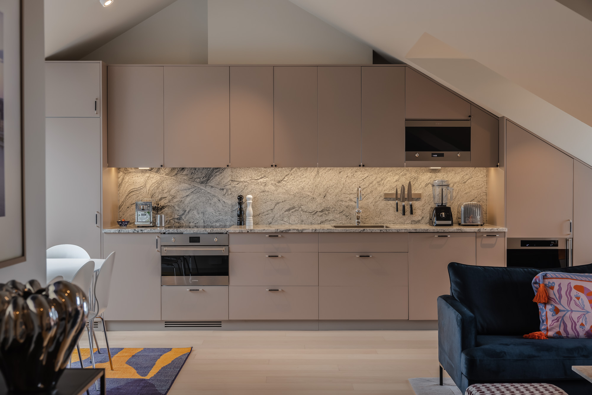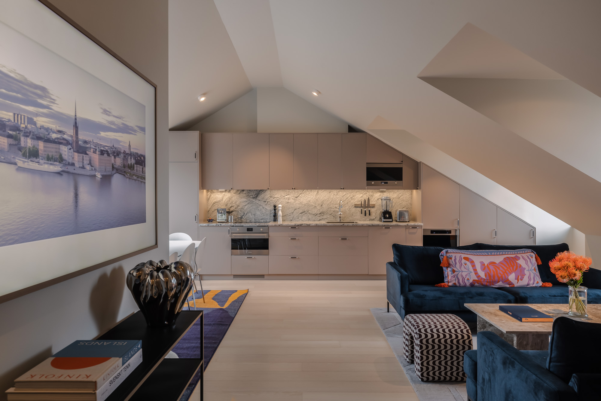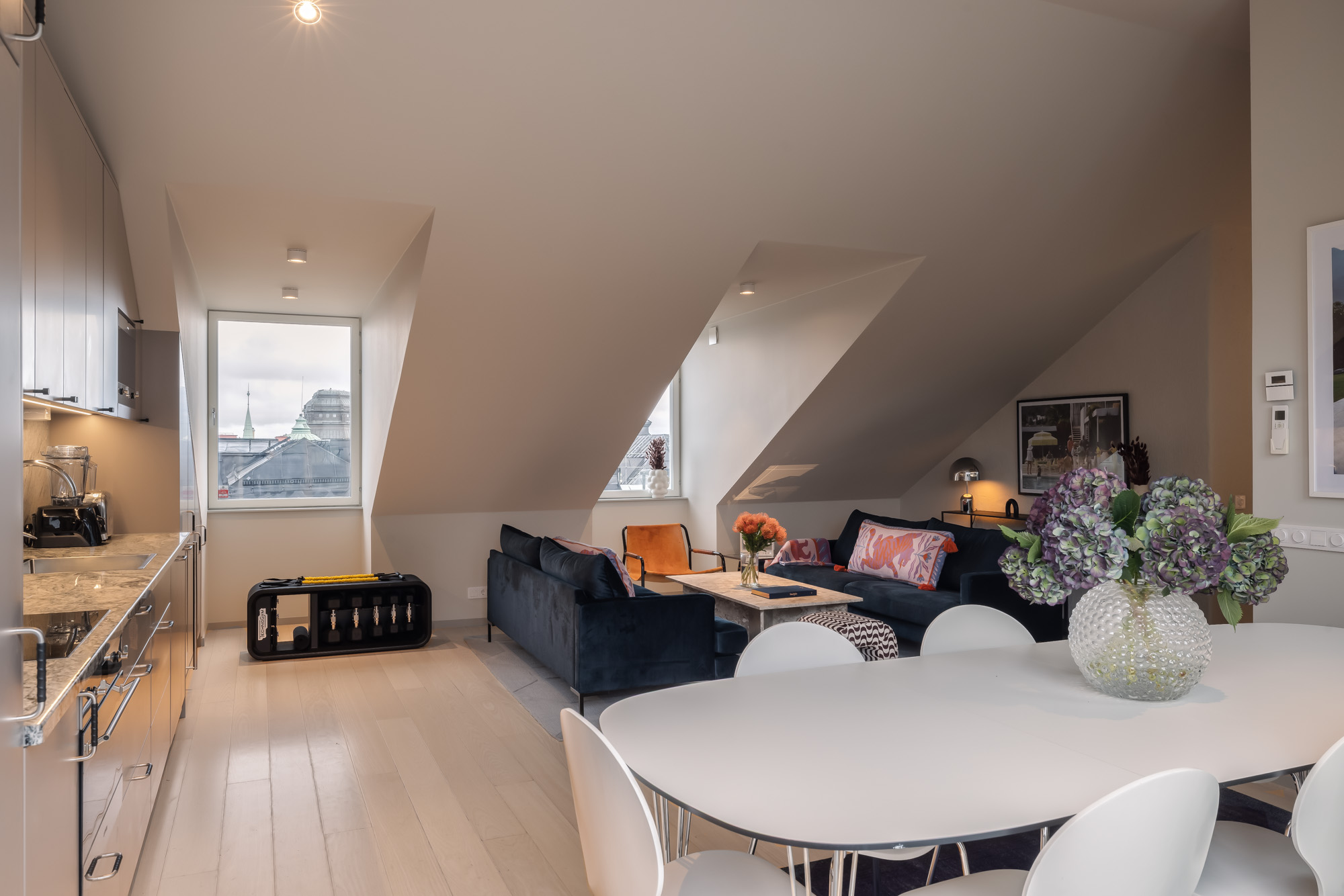 At the center of the residence is a fully equipped gourmet kitchen, complete with high-end appliances including a Dualit toaster, vitamin blender, and a Sjöstrand coffee machine. Whether you prefer leisurely breakfasts or elegant home-cooked dinners, the large dining table—accommodating up to eight guests—sets the perfect scene for memorable meals and gatherings.