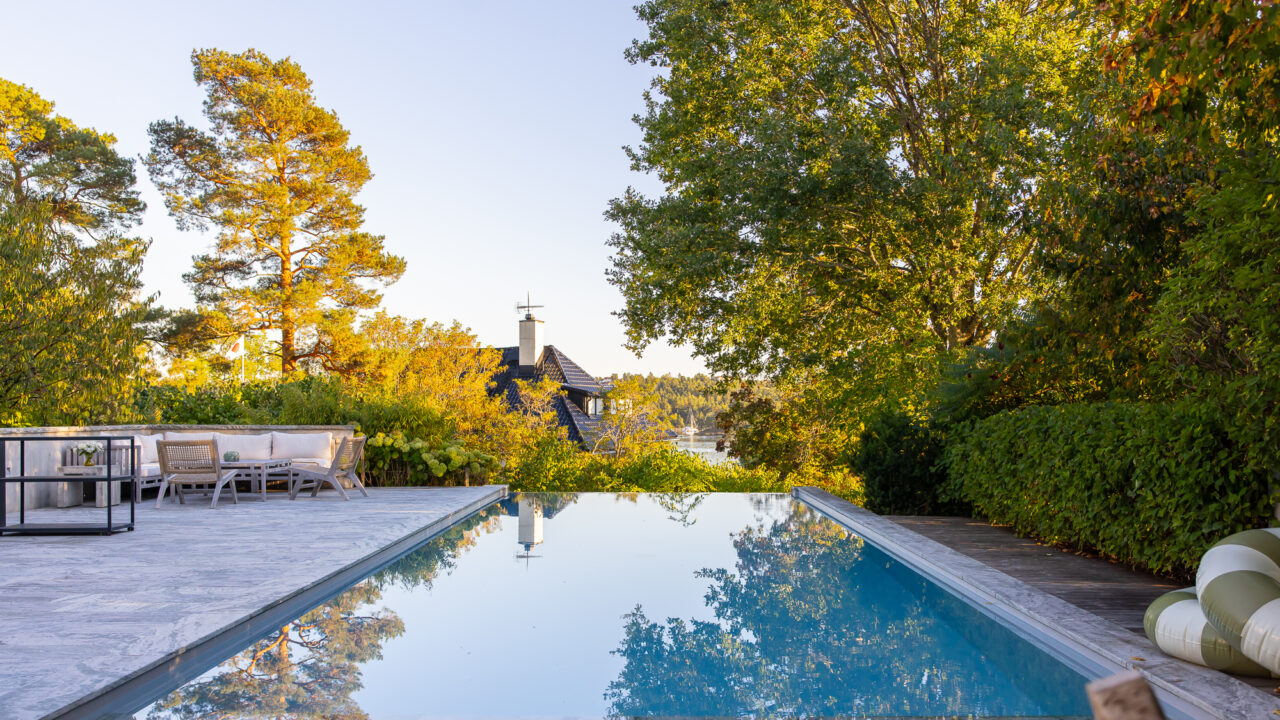 Villa Draupner is an exquisite luxury retreat in the exclusive Djursholm, offering stunning ocean views, a 14-meter infinity pool, beautifully designed interiors, and lush gardens, just 20 minutes from downtown Stockholm.