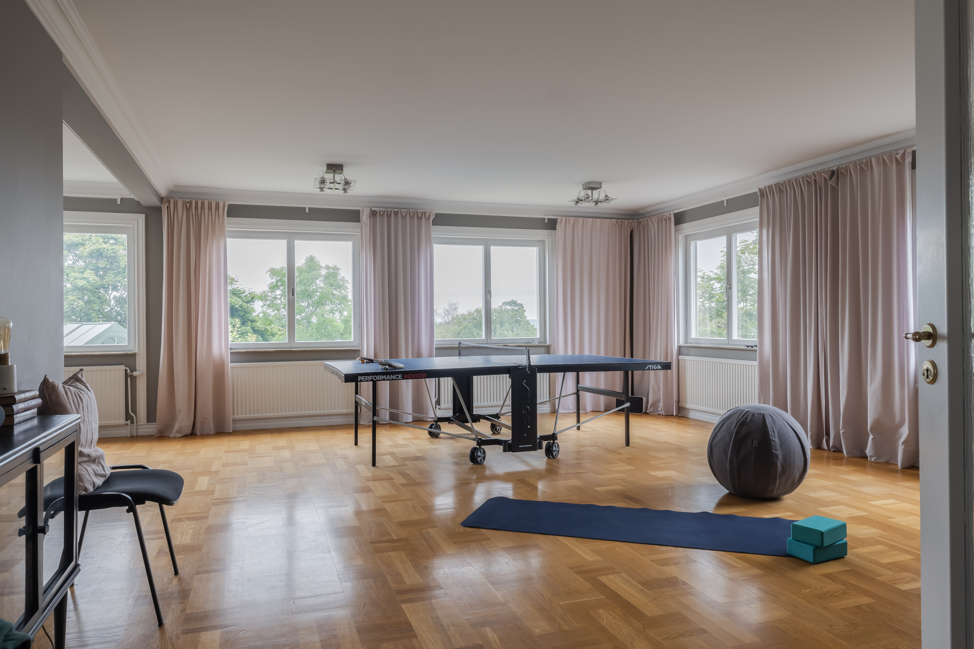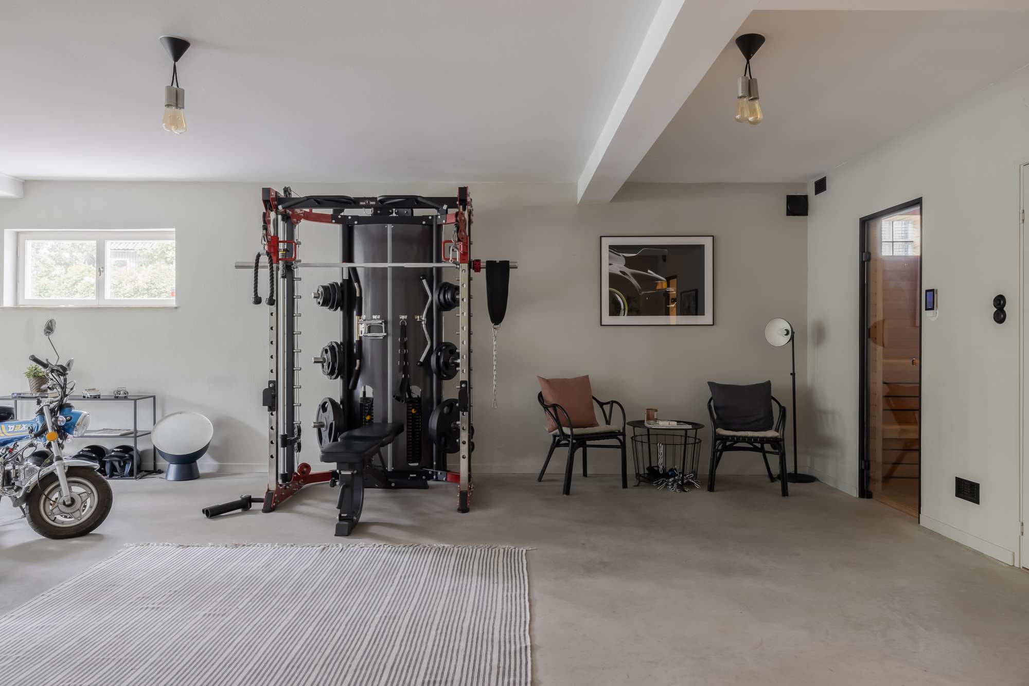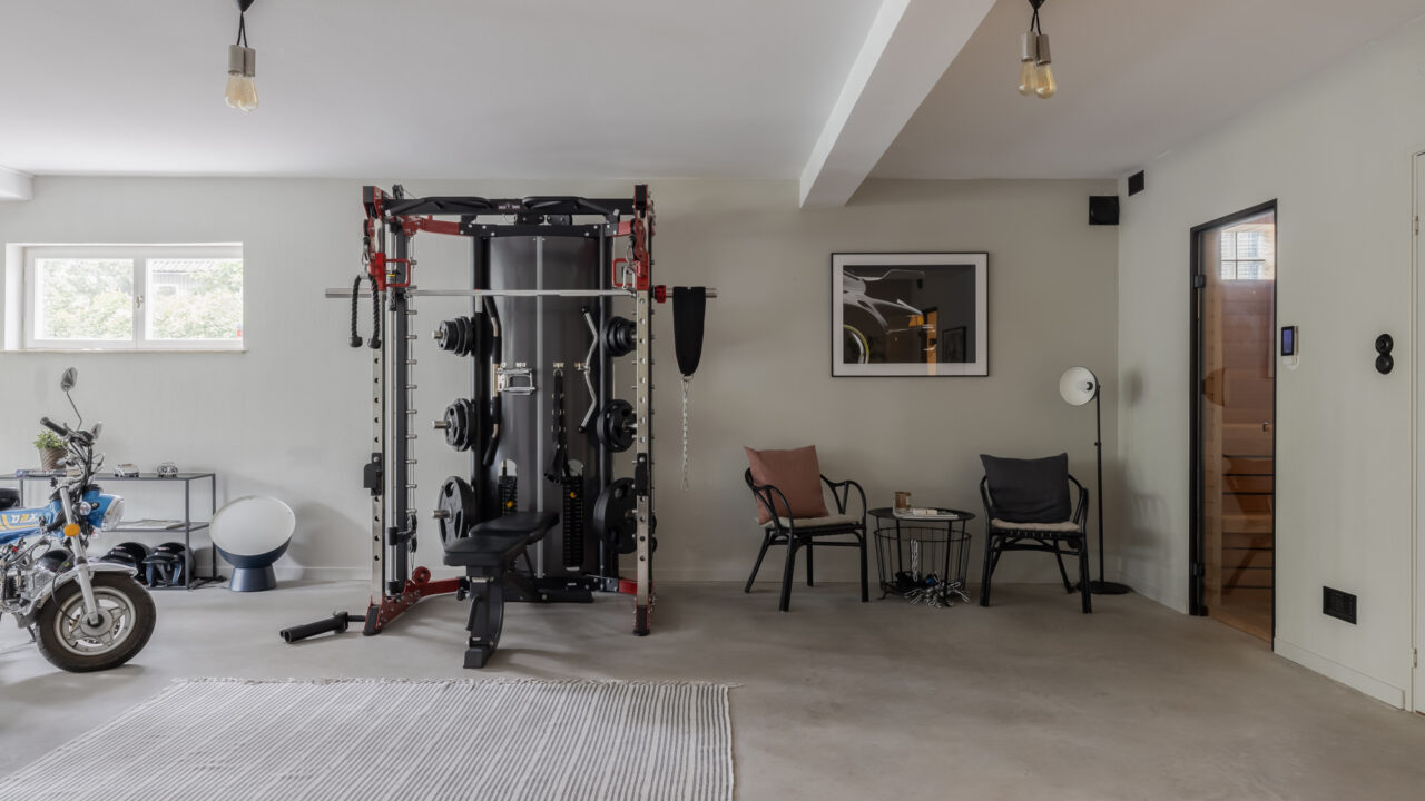 - Lower ground floor: A self-contained apartment with private entrance, kitchenette, bathroom, and bedroom – ideal for staff, extended family, or guests seeking privacy. This level also houses a fully equipped gym, sauna, bathroom, and WC. A large multipurpose hall is perfect for table tennis, yoga, or even small conferences, with an adjoining dining corner for casual meals.