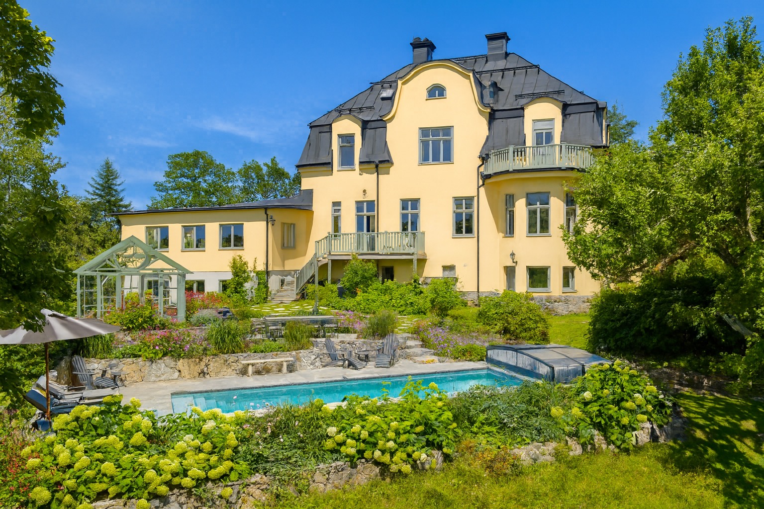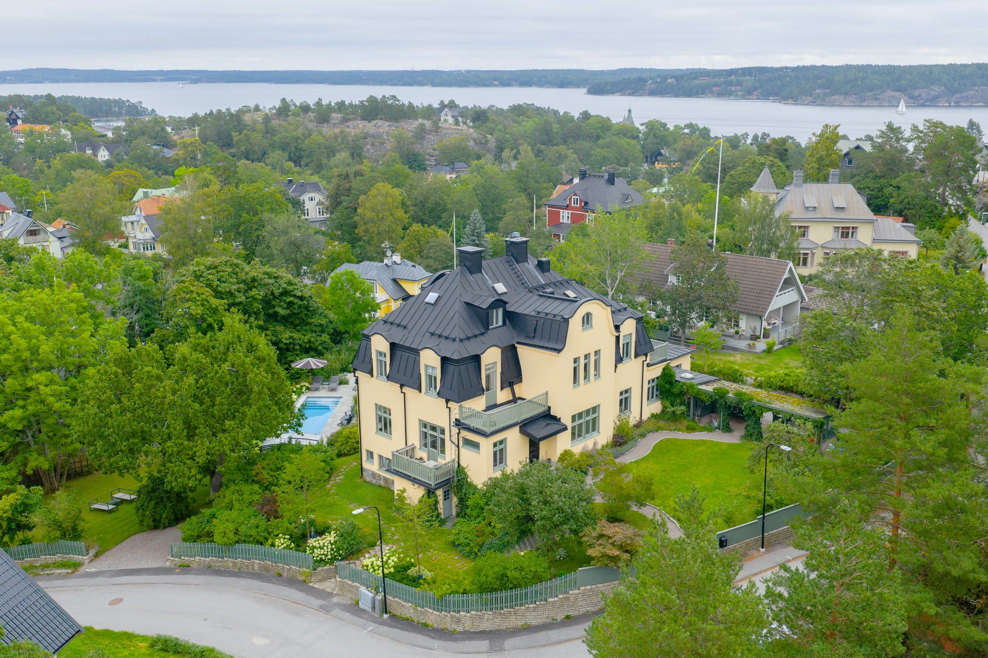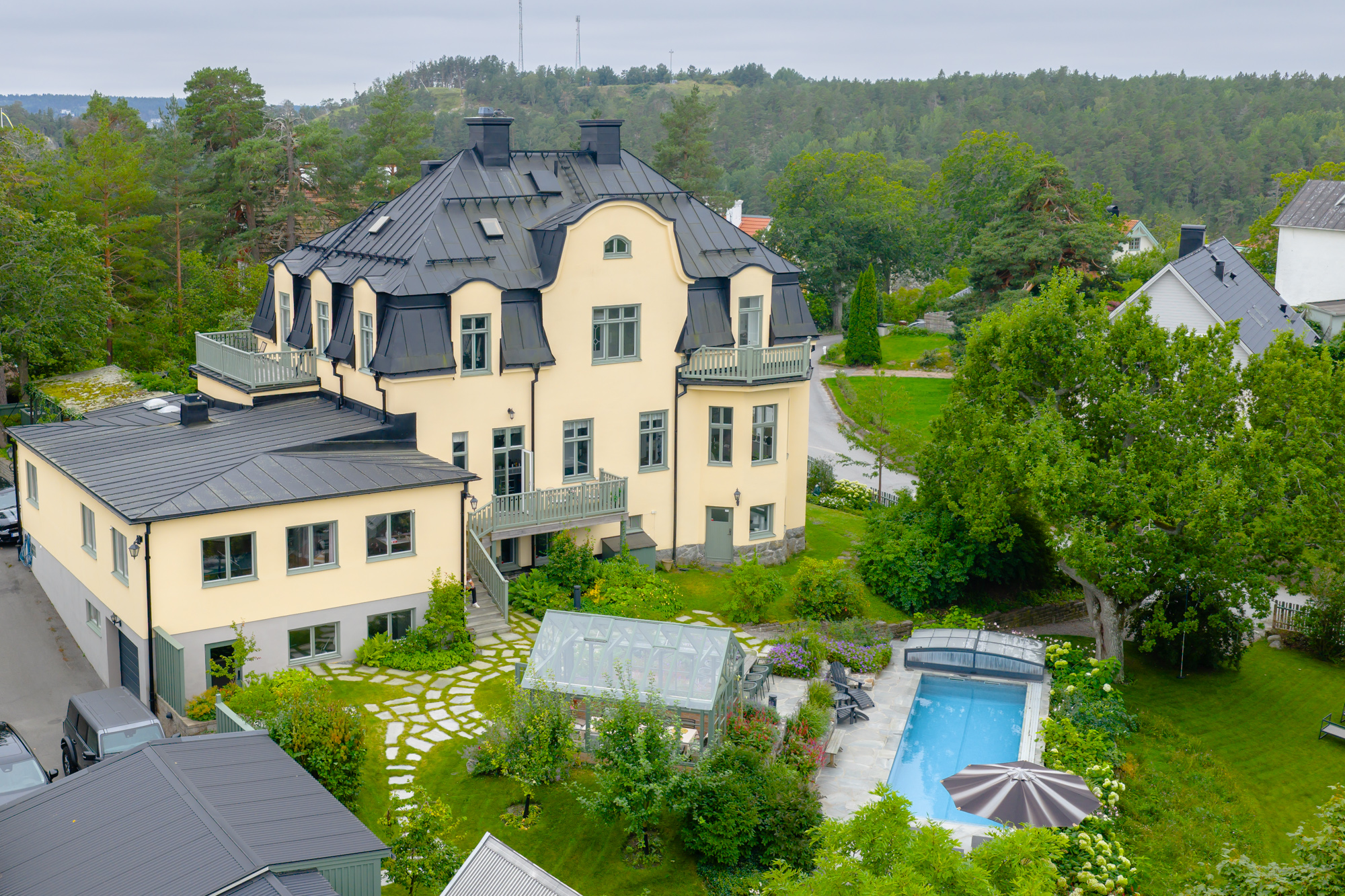 Villa Saltis is a grand 650 sqm residence in the heart of Saltsjöbaden, offering six bedrooms, lush gardens with heated pool, and the perfect blend of Scandinavian elegance and family-friendly comfort.
