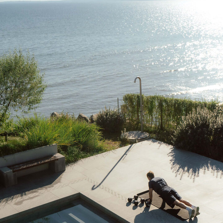 The villa’s outdoor spaces are designed for both relaxation and activity. A heated pool overlooks the sea, while a modern outdoor kitchen, terrace, and lush gardens create the perfect setting for alfresco dining or laid-back afternoons. Guests have access to a private gym, wellness sauna, golf cart, bicycles, SUP board, and padel and tennis rackets for days filled with movement and exploration.
