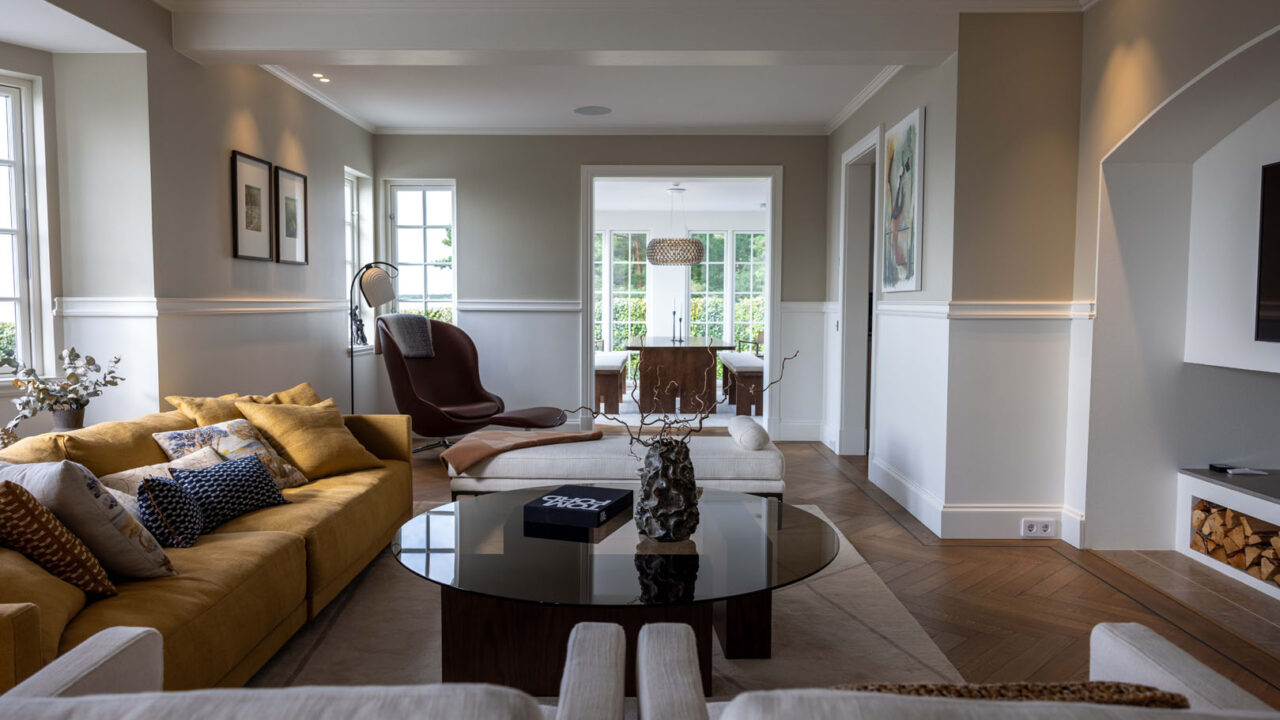The heart of the villa features a stylish Living Room with a functional fireplace, Smart TV, surround sound, and a cozy reading nook. The Kitchen is fully equipped for culinary experiences and opens directly to the outdoor Terrace, where guests can relax in comfortable lounge seating or cook in the outdoor kitchenette with a barbecue and sink. Two patio heaters ensure comfort in cooler evenings.