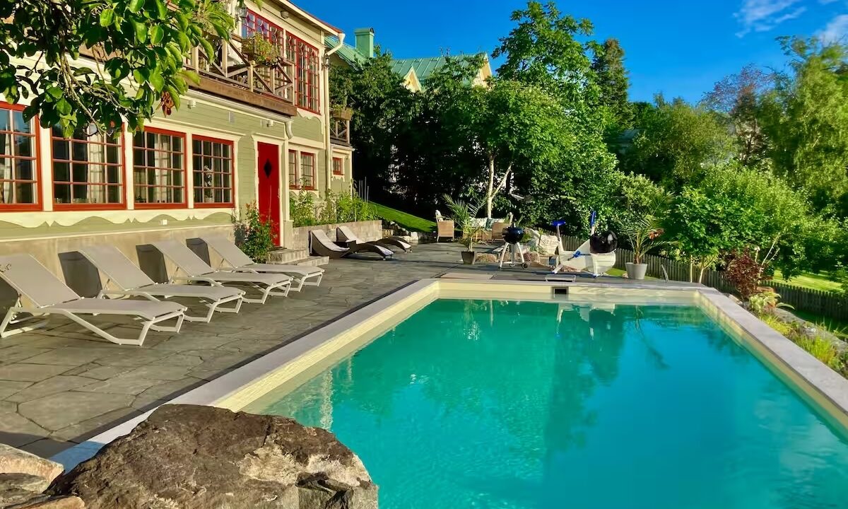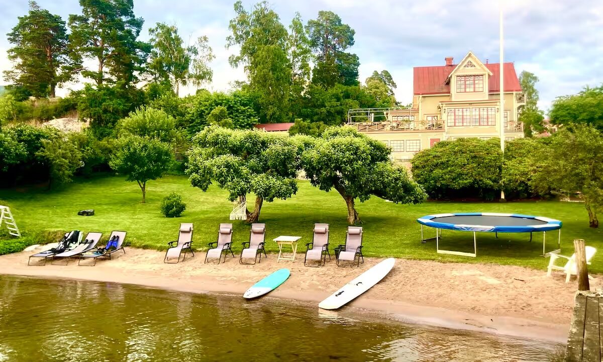 This stunning waterfront villa combines timeless charm and modern luxury, offering a private sandy beach, pool, and year-round amenities for the ultimate Scandinavian getaway.