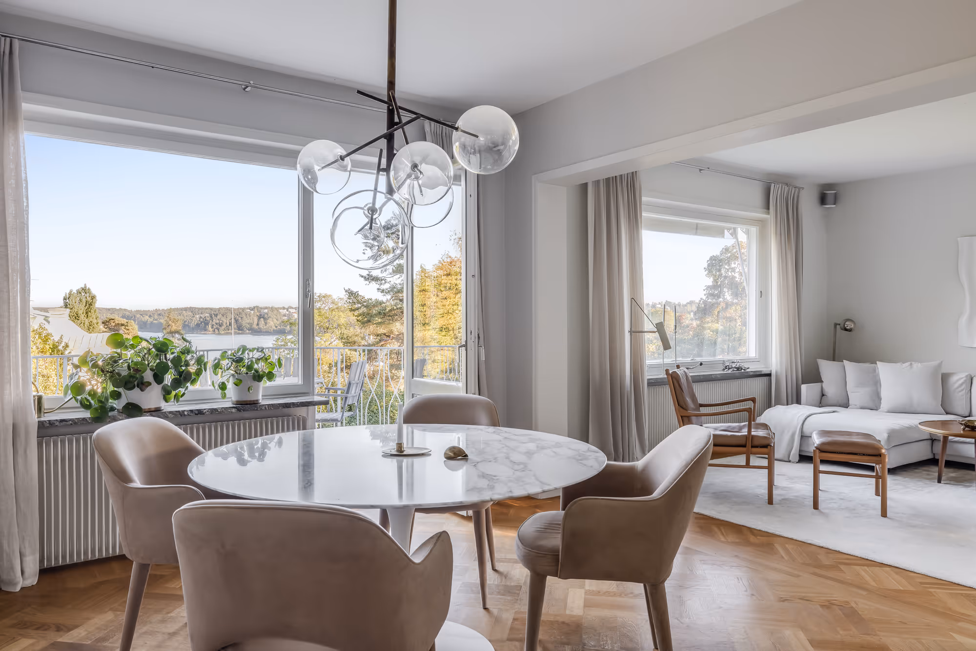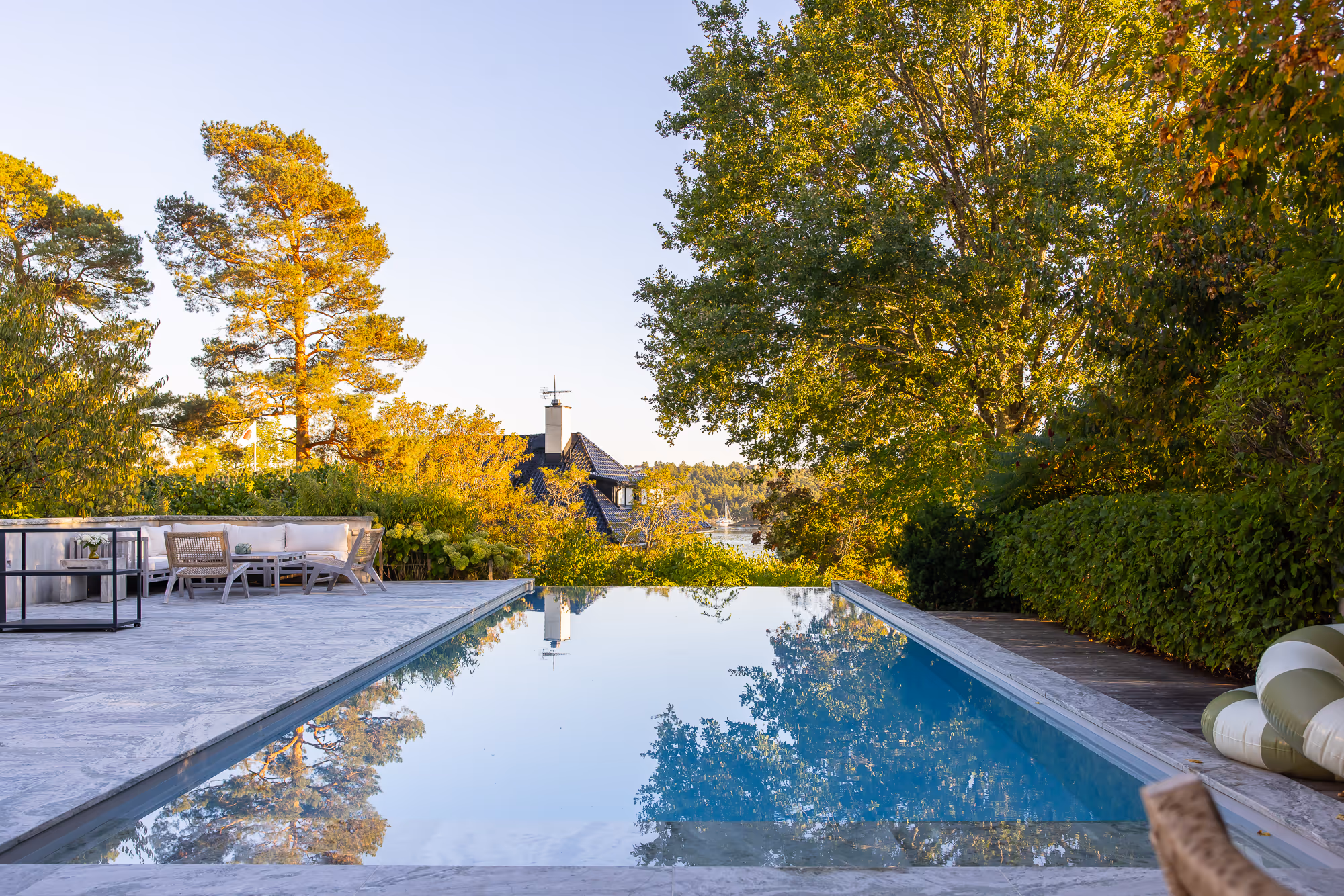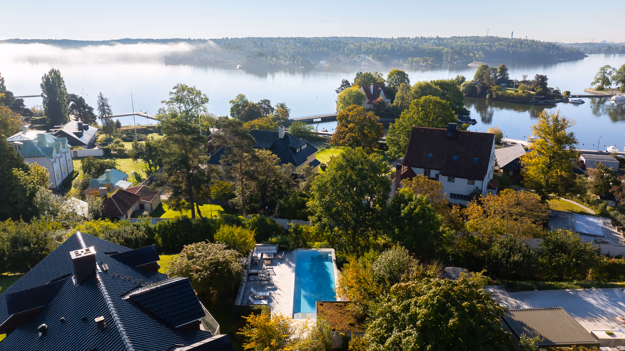 Djursholm sits just 20 minutes from downtown Stockholm, 10 kilometers from the city center. The ocean and boat jetty are 200 meters from the villa. Arlanda Airport is 35 kilometers away, about 30 minutes by car. The area combines serene natural beauty with close proximity to Stockholm's vibrant culture.
