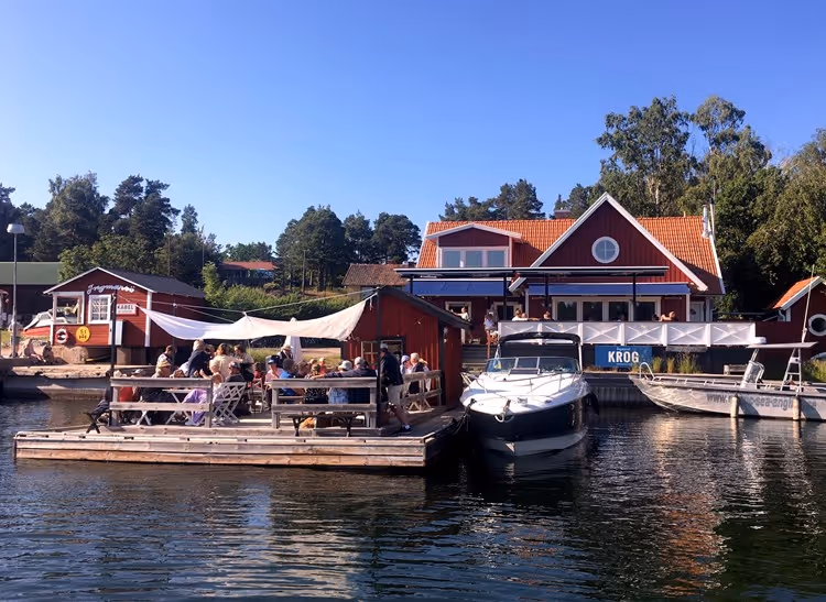 A classic archipelago inn on Ingmarsö — one of those places you can only reach by boat, which is precisely part of the appeal. Ingmarsö Krog serves seasonal Swedish food in a genuine skärgård setting, with its own dock for arriving guests and four mooring buoys for boats up to 6,500 kg. The gästhamn 200 metres away offers an additional 30 berths with showers, sauna and electricity.